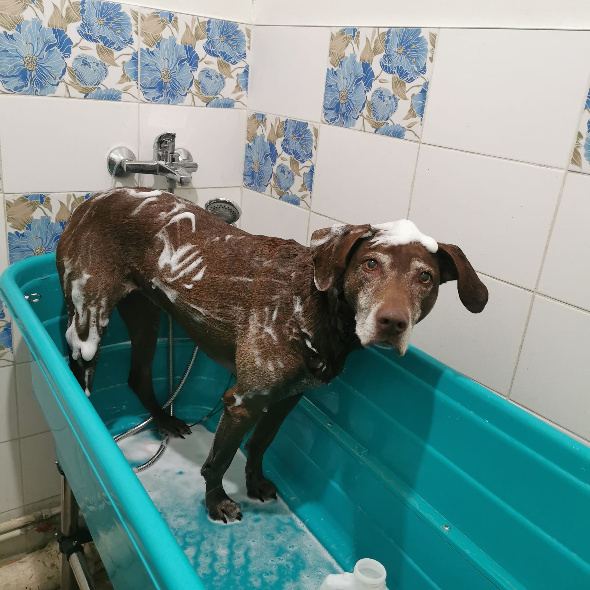 Didelių ir mažų šunų maudymas.